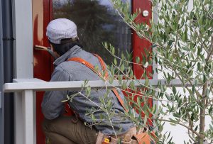 玄関まわりの仕上げの塗装工事に入ります。玄関ドア…