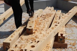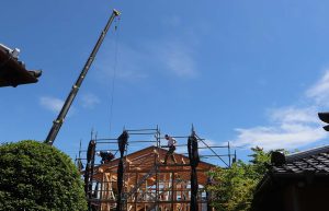 晴れの日をみはからっての建て方。 建て方の日には多くの大工が現場に集います。