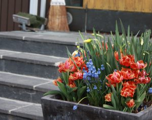 球根の春の花、チューリップ、水仙、ムスカリ、を寄せ植えすると素朴…