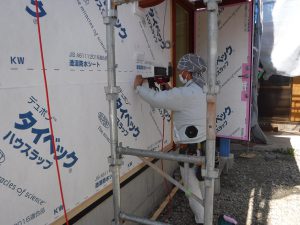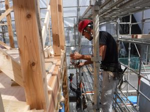 ▼ 建て方が完了し、外部の構造合板施工中 釘の間隔をスケールで確認している様子で…