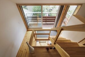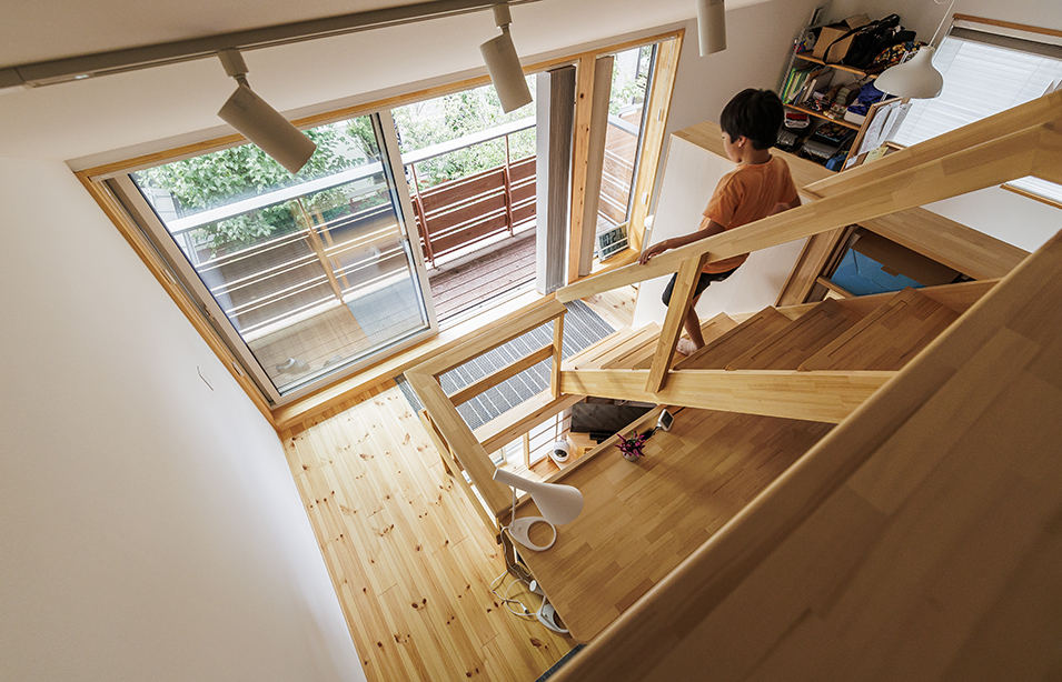 周囲を建物に囲まれた敷地という課題に対し、私たちは吹抜け空間を設けることで、