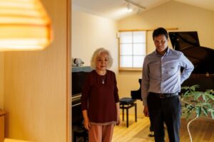 時折ここへピアノを弾きにこられるお母さまと、出来立てのピアノ室でツーショット。